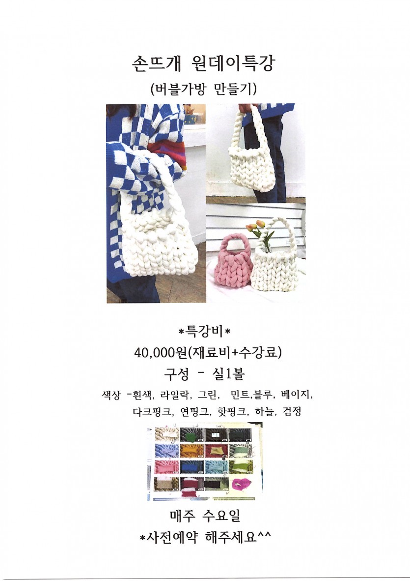 손뜨개 원데이~핑거버블 가방뜨기 페이지 정보 한국문화센터평택지부 0 Comments 2,070 Views 22-11-08 13:52 본문 【손뜨개 원데이】 핑거버블가방 만들기매주 수요일오전 10시~~오후9시 사이특강안내 참고 하시고컬러 선택 후 사전예약 해주세요^^ 이전글손뜨개 특강~친환경 삼베 수세미뜨기 22.11.30 다음글한국문화센터연합회 작품 전시회 22.09.06 Comments 댓글목록 등록된 댓글이 없습니다.